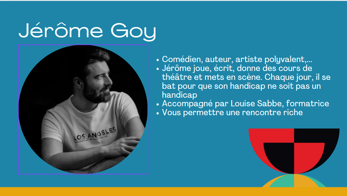 Nous avons eu la chance de pouvoir avoir comme intervenant Jérôme Goy écrivain ayant une défficiance visuelle accompagné par Louise Sabbe. Au cours d’une activité de rencontre il a pu nous faire part de son parcours et des difficultées qu’il a pu rencontrer suite à la découverte de son handicap.